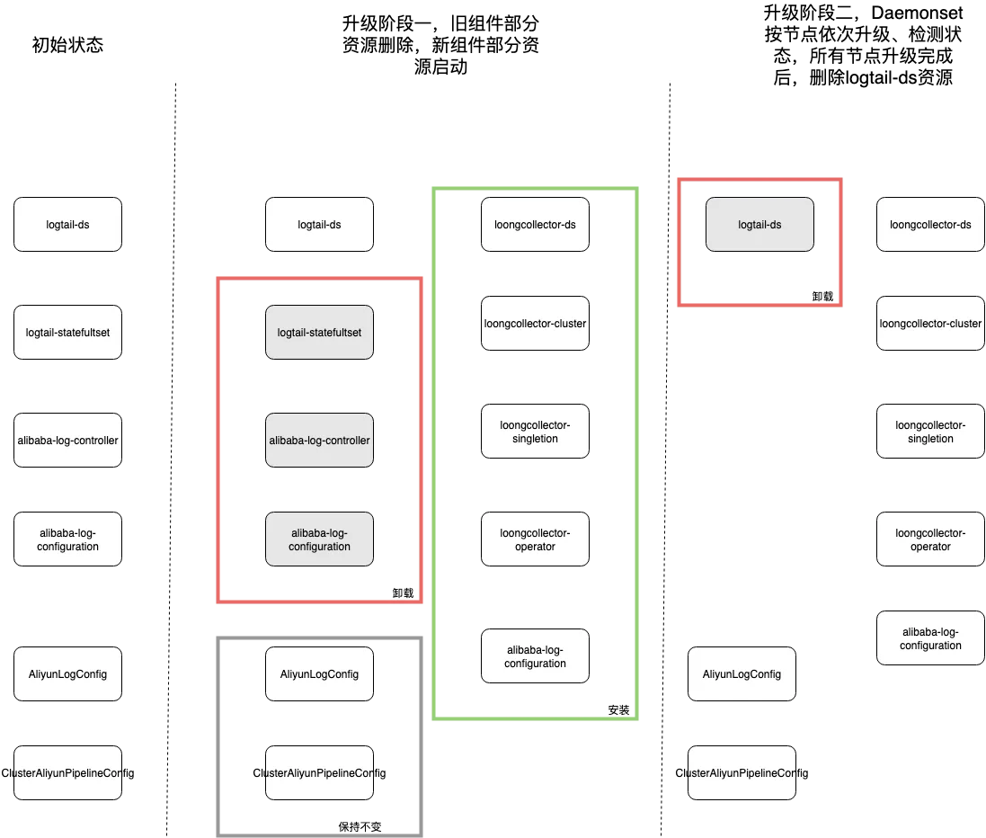 Logtail-ds 由于本身具有 checkpoint 机制,单节点 logtail-ds 停止的时候,会将文件采集的 offset 信息持久化到节点的 checkpoint 中;LoongCollectore-ds 启动的时候,会先从checkpoint 中读取 offset,然后继续从 offset 处开始采集,从而保证数据不重复、不丢失。